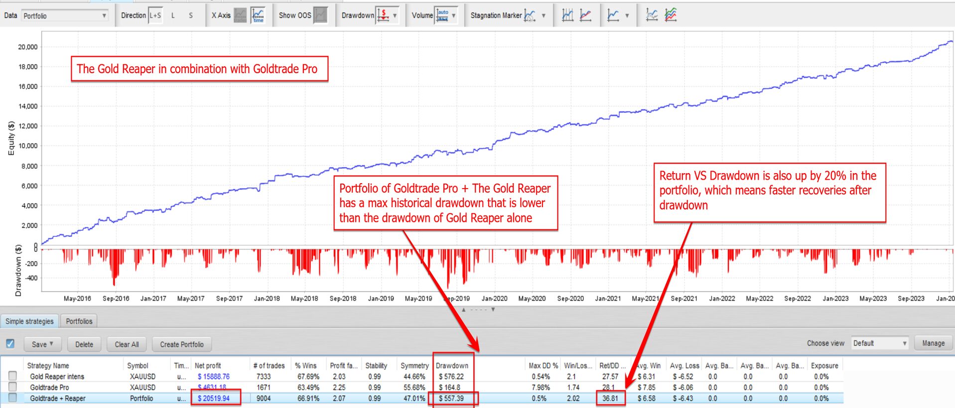The Gold Reaper MT5 is a breakout EA for Gold that runs across multiple timeframes, adapts trade frequency and lot size based on gold price, uses reliable stop-loss & trailing stops. Version 3.5 (Feb 2024).