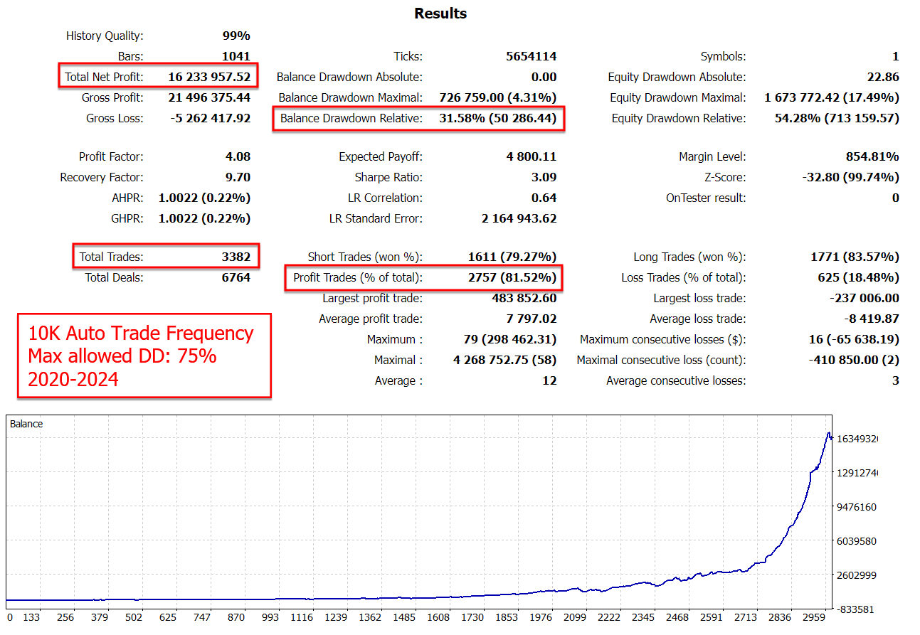Increase frequency slider to “extreme”, moderate lot size, wider stop-loss for more trades—but higher reward/risk potential.